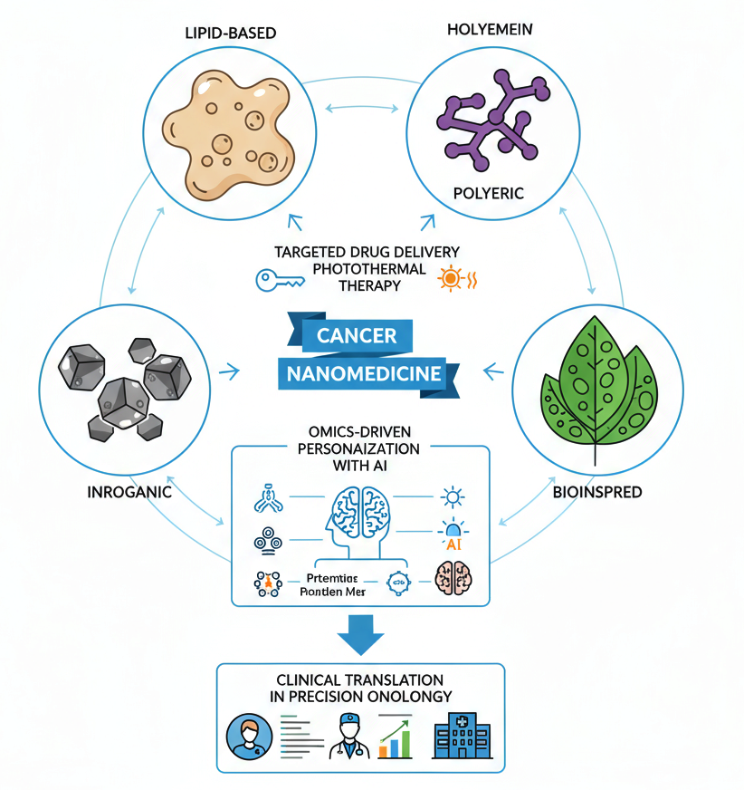 Cancer Nanomedicine; Nanotechnology Therapeutic Platforms; Lipid Nanoparticles; Polymeric Nanocarriers; Inorganic Nanoparticles; Bioinspired Nanosystems; Omics Integration; Multi-Omics; Artificial Intelligence; Precision Oncology; Clinical Trials; Translational Challenges; Stimuli-Responsive Nanomedicine; Personalized Cancer TherapyAbstract